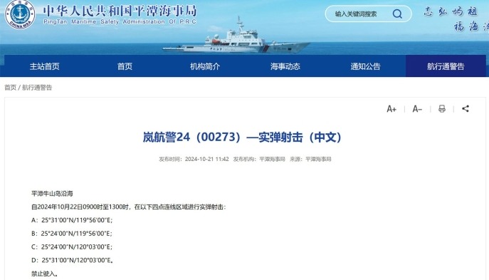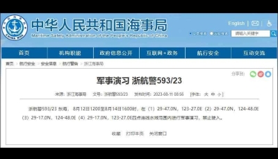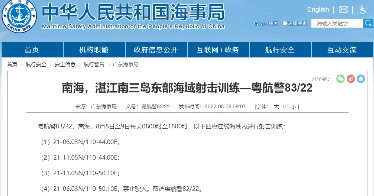 2022年8月2日新華社受權公告:中國人民解放軍將於北京時間2022年8月4日12時至7日12時,在以下海域和空域,進行重要軍事演訓行動,並組織實彈射擊。具體為: 北緯25°15′26″、東經120°29′20″,北緯24°50′30″、東經120°05′45″,北緯25°04′32″、東經119°51′22″,北緯25°28′12″、東經120°14′30″四點連線。 北緯26°07′00″、東經121°57′00″,北緯25°30′00″、東經121°57′00″,北緯25°30′00″、東經121°28′00″,北緯26°07′00″、東經121°28′00″四點連線。 北緯25°34′00″、東經122°50′00″,北緯25°03′00″、東經122°50′00″,北緯25°03′00″、東經122°11′00″,北緯25°34′00″、東經122°11′00″四點連線。 北緯22°56′00″、東經122°40′00″,北緯23°38′00″、東經122°51′00″,北緯23°38′00″、東經123°23′00″,北緯22°56′00″、東經123°09′00″四點連線。 北緯21°14′00″、東經121°33′00″,北緯21°33′00″、東經121°18′00″,北緯21°07′00″、東經120°43′00″,北緯20°48′00″、東經120°59′00″四點連線。 北緯22°43′00″、東經119°14′00″,北緯22°10′00″、東經119°06′00″,北緯21°33′00″、東經120°29′00″,北緯22°09′00″、東經120°32′00″四點連線。 為了安全,在此期間有關船隻和飛行器不要進入上述海域和空域。