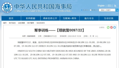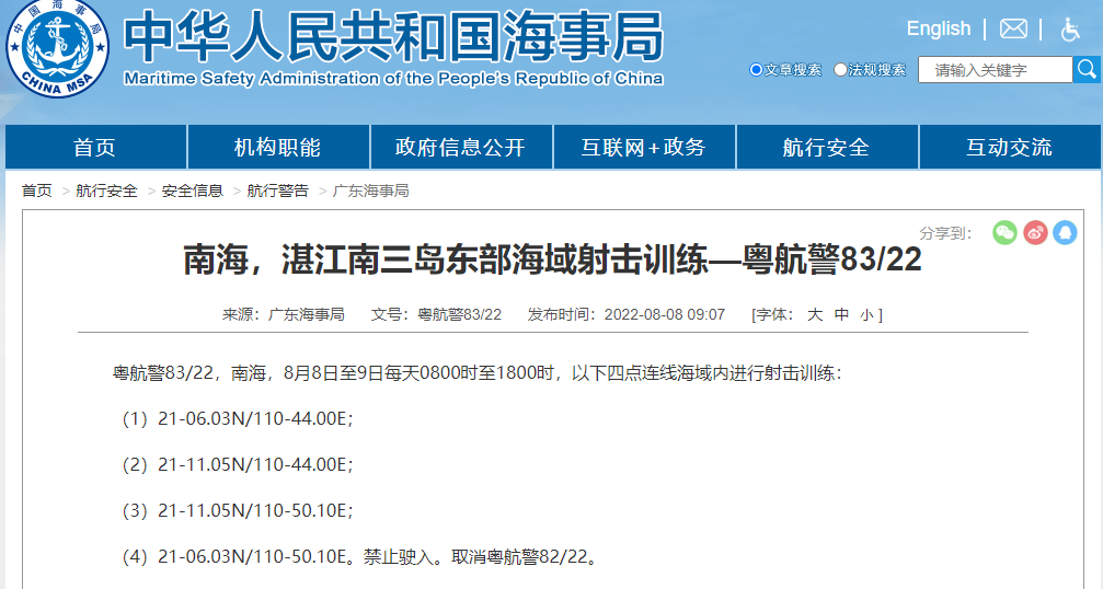 中國海事局網站截圖 廣東海事局6日發佈航行警告,南海8月8日至9日每天0800時至1800時,以下四點連線海域內進行射擊訓練: (1)21-06.03N/110-44.00E; (2)21-11.05N/110-44.00E; (3)21-11.05N/110-50.10E; (4)21-06.03N/110-50.10E。禁止駛入。