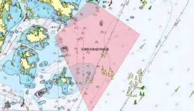 中國海事局網站截圖 連雲港海事局8月5日發佈航行警告,黃海南部自8月6日至8月15日,每日0800時至1800時在34-45.95N 119-19.73E、34-49.98N 119-18.95E、34-52.69N 119-20.31E、34-51.86N 119-23.82E、34-48.53N 119-23.55E四點連線範圍內進行實彈射擊,禁止駛入。