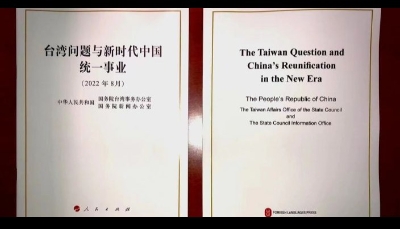 國台辦發表《台灣問題與新時代中國統一事業》香港中通社8月10日電 中國國務院台灣事務辦公室、國務院新聞辦公室10日發表《台灣問題與新時代中國統一事業》白皮書,進一步重申台灣是中國的一部分的事實和現狀,展現中國共產黨和中國人民追求祖國統一的堅定意志和堅強決心,闡述中國共產黨和中國政府在新時代推進實現祖國統一的立場和政策。