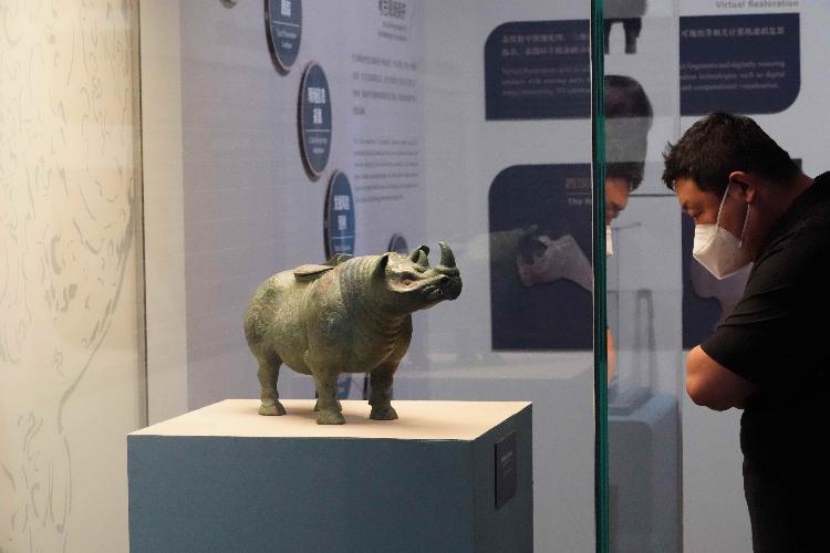 觀眾觀看展覽中用3D列印的出土犀牛青銅器。 香港中通社圖片 國博建立之初,就確立了以保護文物為己任。新中國成立後,歷經70餘年,文保力度和水平不斷增強,并注重傳統工藝與現代科技結合,成就突出,收獲頗豐。作為文保領域的專業機構,國家博物館文保院現已成為集文物檢測、研究、保護、修復和複制於一體的現代化文保機構,水平居於國際領先地位。 在展覽中,為讓觀眾更多了解文保知識,主辦方用9個重點案例呈現給觀眾,包括:宋代钜鹿故城文物修復;青銅重器的複制(後母戊鼎、大盂鼎、四羊方尊等);郎世寧《松鶴回春圖軸》的科學分析;金石傳拓(大盂鼎,虢季子盤,利簋);油畫修復與複制;西漢錯金銀雲紋犀尊仿制品;文物現場保護;現代科學儀器助力文物保護等。 位於當今河北省巨鹿縣西南钜鹿故城,於宋大觀二年(公元1108年)因黃河決口而被淹沒。1915年前後,故城所在地時有宋代古物出土,并伴有盜掘事件發生。1921年,國立歷史博物館籌備處委派裘善元等人前往調查,并獲得瓷陶雜器二百餘件,之後陸續對部分文物進行修復。這是國博早期文物保護的一個重要案例。本次展覽選取了一組實物,從中可以看出早期瓷器修復的理念與方法。 中國傳統青銅器修復、複制技術源遠流長,多年來國博對館藏大量珍貴青銅器修復和複制。最具代表性的是對後母戊鼎進行保護,完成了包括清除有害銹、科學檢測、測定重量,以及原樣複制等一系列工作,還對鼎耳、四足、器身四面、器底及內壁,均進行單獨翻制矽橡膠模具和玻璃鋼樹脂套模,採用現代精密鑄造方式,鑄造出複制品銅胎,再比對原文物,採用傳統工藝隨色作舊,其複制品達到亂真程度。本次展覽中,觀眾有幸一睹婦好墓司丂(kao)母斝、庚兒鼎,以及大盂鼎、四羊方尊等國家一級文物的複制品。