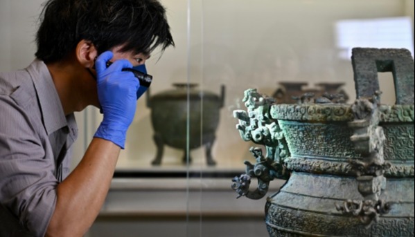 展覽中展示用專業儀器對文物進行鑒定和修復。 香港中通社圖片 清朝“嘉道時期”出現的全形拓技藝,將器物形神兼備地反映在紙上,堪稱文保領域的絕技。國博的金石傳拓源自金石名家周希丁先生,其弟子傅大卣先生作為國博顧問授徒傳藝,幾代人先後為國博物傳拓“後母戊鼎”“虢季子白盤”“大盂鼎”青銅重器等文物千餘件,對展覽、研究等起到了重要作用。本展覽上 “後母戊鼎器形花紋拓片”等珍貴拓本亮相,實為難得一見。 伴隨數字技術在文保領域的應用,國博啟動文物三維數字化項目,全方位留存了文物的三維數據,為文物複制、數字化保護與利用提供了數據支撐。一批掌握數字技術的文物修復工匠,通過3D打印與傳統工藝結合,仿制了包括西漢錯金銀雲紋犀尊、商代婦好墓青銅觚等一批青銅器,拓寬了文物複制的途徑和方法。上述兩件仿制青銅器也在展覽中展出。