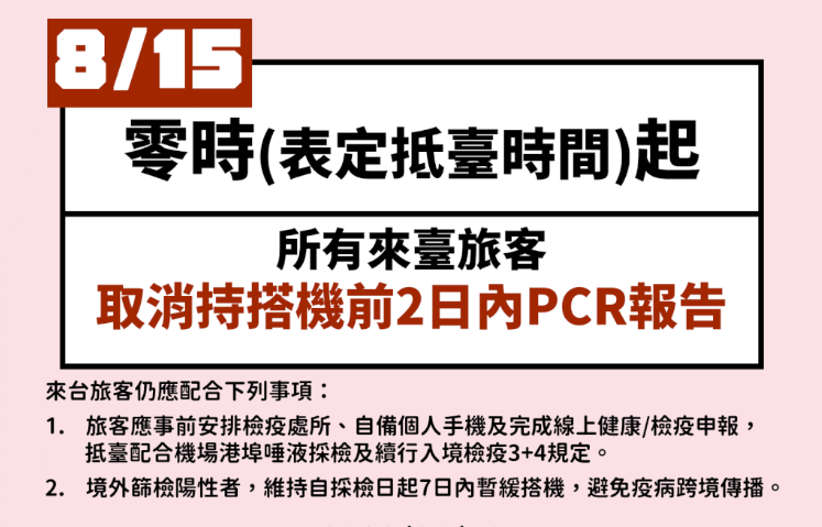 香港新聞網8月11日電 台灣疫情指揮中心宣佈,15日起所有來台旅客取消提供搭機前2日內核酸陰性報告的規定。旅客扺台後需配合機場港埠唾液採檢,繼續執行入境檢疫“3+4”規定,即醫學隔離三天和居家自我觀察四天。但若境外篩檢陽性者,仍維持自採檢日起7日內暫緩搭機。