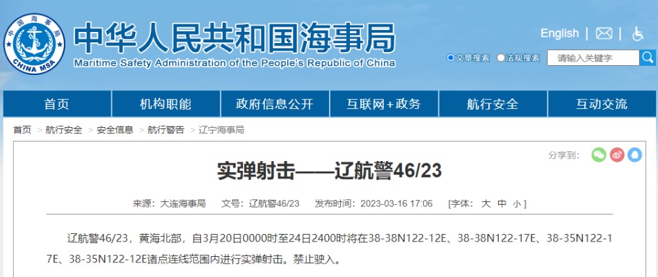 大連海事局:渤海部分海域13日將進行實彈射擊