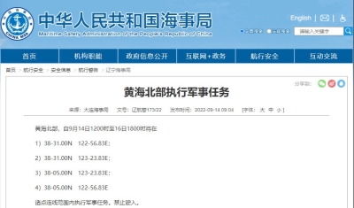 香港新聞網8月14日電 據中國海事局網站14日消息,大連海事局、防城港海事局發佈航行警告,將在渤海和北部灣特定海域執行軍事任務,禁止駛入。 據大連海事局消息,渤海海峽黃海北部,自8月14日16時至28日16時將執行軍事任務。禁止駛入。