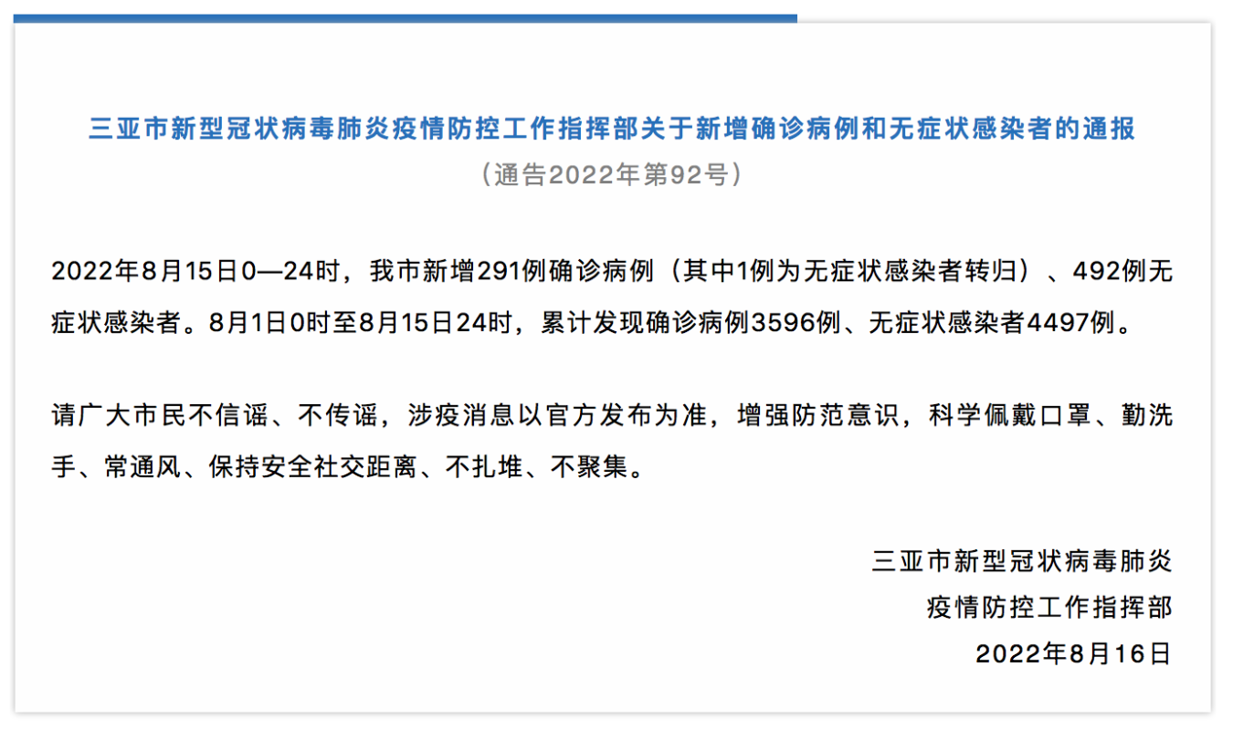 香港新聞網8月16日電 海南三亞疫情防控指揮部16日通報,8月15日0時—24時,該市新增291例確診病例、492例無症狀感染者。本輪始於8月1日的疫情,累計發現確診病例3596例、無症狀感染者4497例。據風險研判,三亞疫情處於高位平台波動期,上昇勢頭得到有效遏制。疫情總體可控,須以更大力度盡快實現社會面清零。