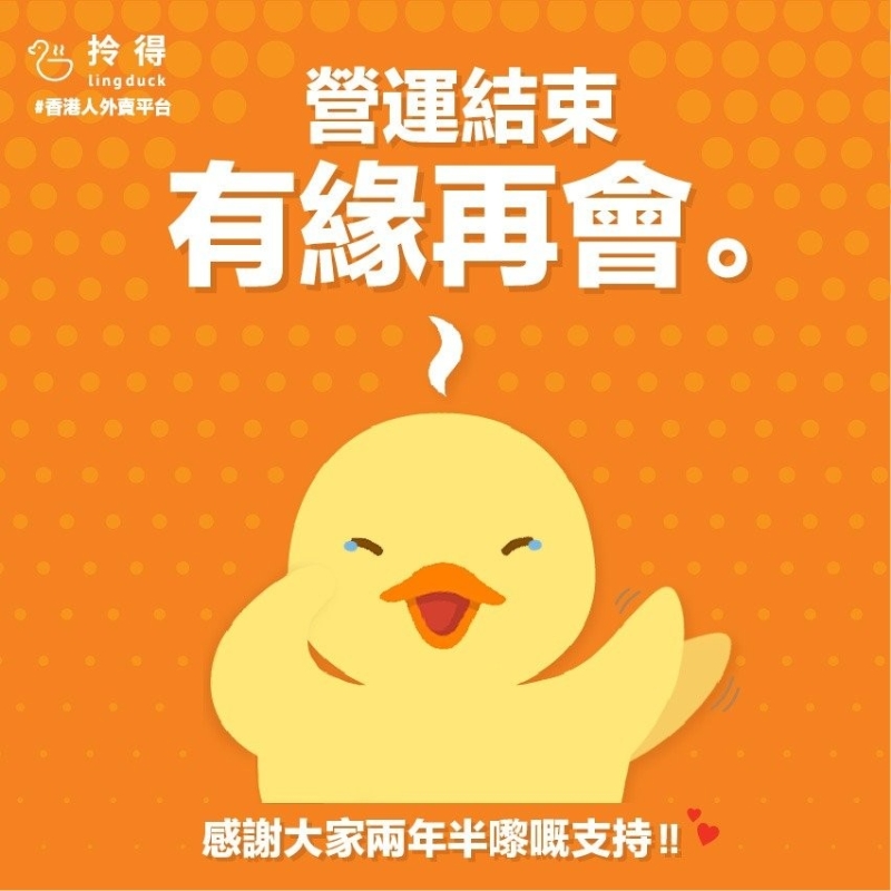 香港新聞網8月18日電 繼Uber Eats後,另一個外賣平台“拎得lingduck”近日亦宣布由於種種原因,將於8月31日後停止營運。