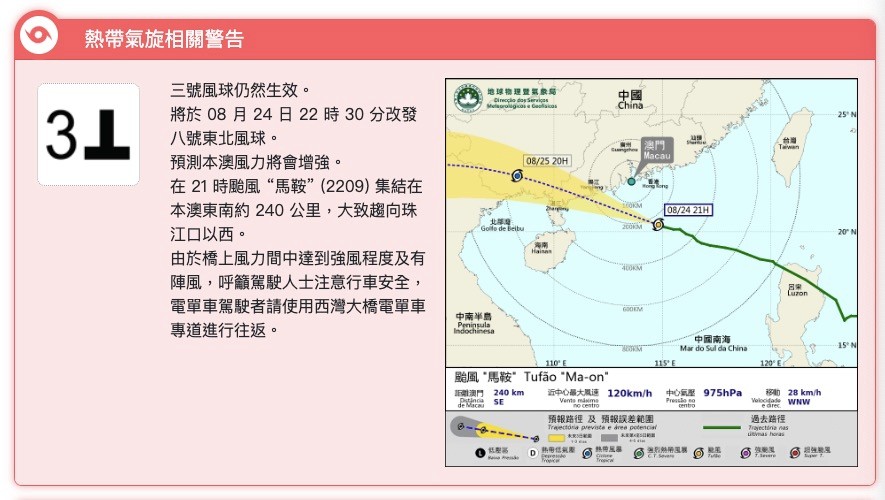 (持續更新)“馬鞍”逼近 港澳掛八號風球香港新聞網8月24日電 強烈熱帶風暴“馬鞍”吹襲香港,香港天文台24日晚上7時25分發出八號東北烈風或暴風信號,預計“馬鞍” 25日最接近香港,在香港西南偏南約200公里範圍內掠過,構成相當威脅。八號烈風或暴風信號會至少維持至25日早上6時。此外,澳門氣象局預告將於24日晚上10時30分改發八號東北風球。