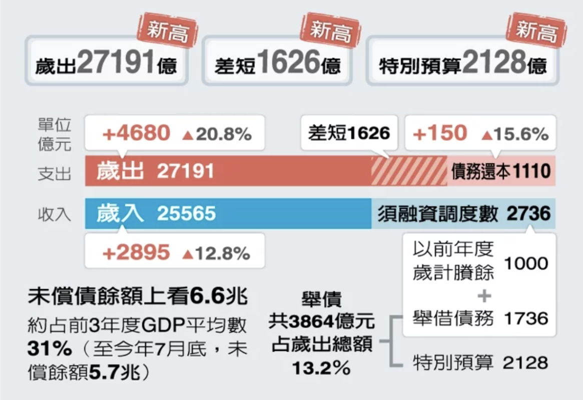 台當局2023年度總預算編列概況 (圖片來源:台灣“聯合新聞網”) 然而,台灣的舉債金額也再度增加,明年度預計舉借1736億元,再加上特別預算的舉借債務2128億元,舉債金額高達3864億元,佔歲出總額的13.2%。 根據台灣“公共債務法”規定,總預算及特別預算每年度舉債額度,不得超過其總預算及特別預算歲出總額的15%。2023年度的預算案中,上述舉債金額並不包含新冠肺炎特別預算案所舉借的債務。換言之,明年度預算案的實際舉債總額恐已超過公債法規定。 台當局審計主管部門在2021年度總決算審核報告中即指出,按當局今年3月30日所更新的收支概況,若收支包含總預算及特別預算,除2018、2019年度有盈餘外,2020及2021年度均短絀,2022年短絀更預計高達4000多億元。 報告中提到,債務不斷累積與當局推動前瞻建設、武器採購及海空戰力提升,再加上新冠肺炎紓困振興等計劃,編列多項特別預算有關。且相關特別預算的歲出規模龐大,又難增加財源,導致總預算加特別預算後,歲入歲出差距擴大。 審計部門並指出,當局債務未償餘額自2017年底的5.3482萬億餘元微降至2018年底的5.312萬億餘元後,近年來逐年升高至2021年底的5.6847萬億餘元,預估到今年底將突破6.3萬億元。 而明年度總預算案顯示,當局債務未償餘額(即一年以上非自償性債務)預計於今年底達到6.3萬億元後,明年度更上看6.6萬億元,約佔前三年度平均GDP的31%。