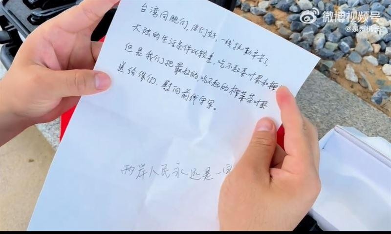 大陸網友將準備空投的茶葉蛋放入瓶中 (截自微博“泉州機長”視頻) 信中寫道,“台灣同胞們,你們好,一線執勤辛苦了,大陸的生活條件比較差,吃不起茶葉蛋和榨菜。但是我們把最好的、吃不起的榨菜茶葉蛋送給你們,慰問前線守軍。”信的最後並特別強調,“兩岸人民永遠是一家人”。