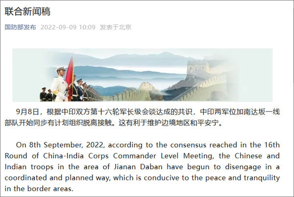 據微信公眾號“國防部發布”消息,9月8日,根據中印雙方第十六輪軍長級會談達成的共識,中印兩軍位加南達阪一線部隊開始同步有計劃組織脫離接觸。這有利於維護邊境地區和平安寧。