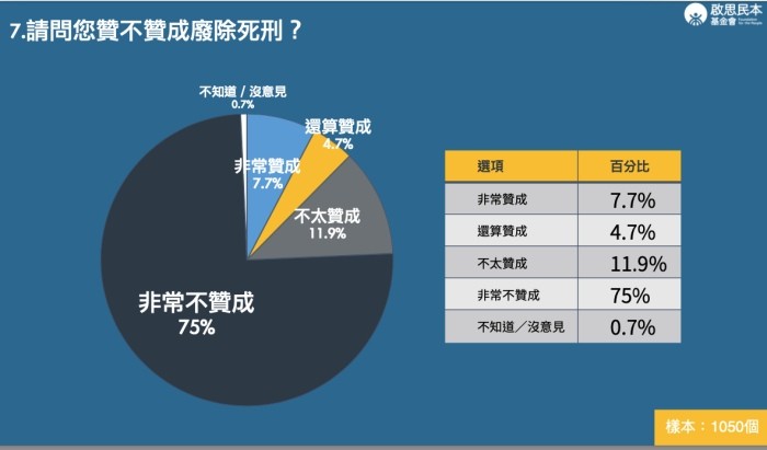 香港中通社9月12日電 台灣啟思民本基金會12日公布9月份廢死議題相關民調,顯示有75%台灣民眾非常不贊成廢除死刑、不太贊成的民眾也達11.9%,合計約有86.9%民眾不贊成廢除死刑。