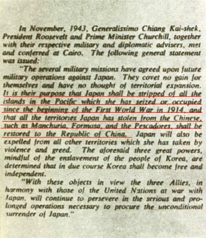 《開羅宣言》英文文件 這本不該有異議,但長期以來,日本在釣魚島問題上不時製造事端。2012年,在中日邦交正常化40周年之際,日本政府竟宣佈要“購買”釣魚島及附屬的南小島、北小島,實施所謂“國有化”,中日關係急速惡化。各地紛紛開展保釣運動,這其中不乏港台人士的身影。時任台灣地區領導人馬英九便多次表明立場,認為在釣魚島立場上要採取“寸土片石,在所必爭”的原則。 其實,港台人士的保釣歷史可以追溯到1970年。當時美國宣稱將把釣魚島“施政權”給日本,普林斯頓大學的中華民國留學生組成“保衛釣魚島行動委員會” 力爭主權,海外留學生保釣運動正式開始。1971年1月29日,二千多位台灣及香港留美學生在聯合國總部外面示威高呼“保衛釣魚島”,並分別在紐約、芝加哥、西雅圖及夏威夷遊行示威。4月10日,在美國華盛頓舉行留美學界盛況空前的“保衛中國領土釣魚島”大遊行,是歷次示威運動的最高潮。