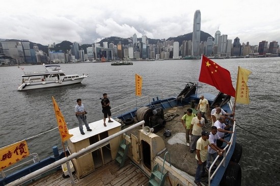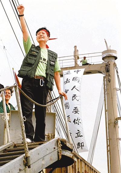 1996年9月22日,“全球華人保釣大聯盟”18名代表出發往釣魚島,召集人陳毓祥在標語前呐喊口號。圖片來源:香港文匯報 1996年10月7日,港台保釣人士成功登陸釣魚島,並一同在島上同時揮舞兩岸標誌性旗幟,以表示釣魚島是所有中國人的領土。2012年7月4日,台灣民間保釣人士乘船前往釣魚島海域進行“保釣”活動,台當局派5艘艦艇護航。2012年8月15日,香港保釣人士駕乘“啟豐二號”抵達釣魚島並成功登島,將香港保釣運動推向高潮。
