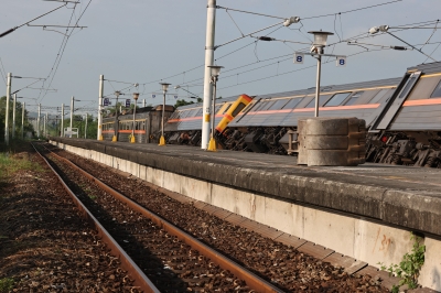 台鐵局說明,18日下午受地震影響,東里站月台雨棚掉落撞及420 次致出軌,有3節車廂站內傾斜,旅客約20人已離開車廂,到達月台;東里-東竹間為單線區間目前中斷,已啓動公路接駁。