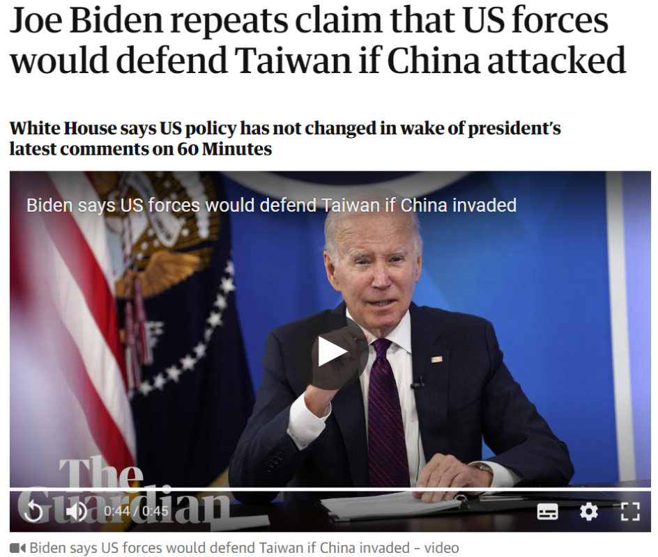 英國《衛報》報道截圖 文章稱,拜登接受美國哥倫比亞廣播公司(CBS)《60分鐘》的采訪,當被問及美國軍隊是否會“保衛”台灣時,拜登回答稱:“會,如果(台灣)遭到了史無前例的襲擊。” 當被要求進一步闡明是否意味著此舉將與烏克蘭不同,美國軍隊(美國人)將在中國大陸武統台灣的情況下“捍衛台灣”,拜登依舊給出了肯定的回答:“是的。” 文章指出,此次采訪是拜登有關“派遣美軍‘保衛’台灣”的聲明中“最明確的一次”。