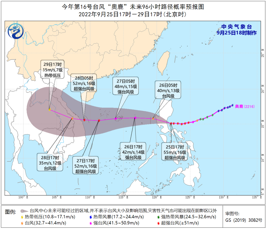颱風“奧鹿”大風預報 圖源:中央氣象台 今年第16號台風“奧鹿”9月23日下午在菲律賓以東洋面生成,24日傍晚到夜間從強熱帶風暴級快速增強至超強台風級。25日17時其中心(超強台風級)位於菲律賓馬尼拉東偏北方向約135公里的西北太平洋洋面上。菲律賓當地至少六個省發出最高的第五級台風預警,並宣佈26日政府部門暫停辦公、學校停課、股票交易所休市。 颱風“奧鹿”26日上午進入南海中東部海域,28日上午在越南東部沿海登陸。