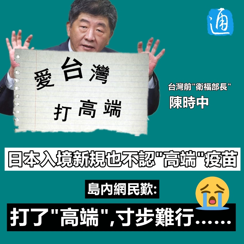 香港新聞網9月27日電 日本日前宣佈將開放自由行旅客入境,然而台當局砸重金研發的“高端”疫苗卻不在日方認可的疫苗名單內。台灣前“衛福部長”陳時中過去2年不停吹噓“高端”疫苗將被世界認可,如今兩手一攤,只淡淡表示“不能強迫人家”,一副“非常理解”的樣子。 這可坑慘了被台當局忽悠打了“高端”疫苗的百萬島內民眾,打了“高端”,寸步難行,還有苦說不出。