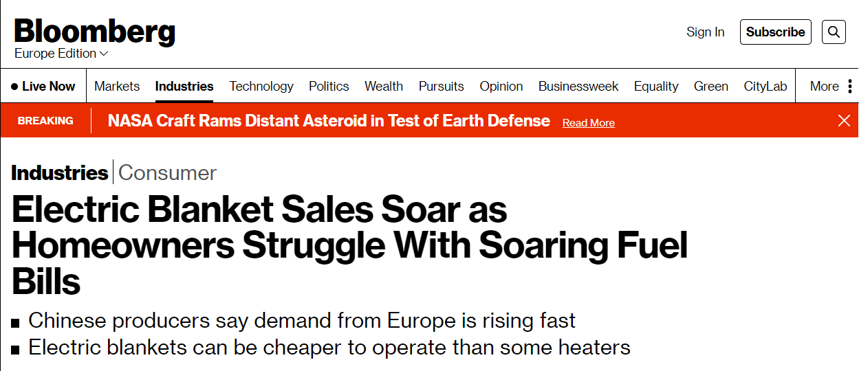 美國彭博社報道截圖 文章稱,受俄烏戰爭的影響,歐洲天然氣因供應緊縮而價格暴漲,這促使各國政府開始制定能源配給計劃,歐洲即將迎來一個“艱難的冬天”。許多歐洲家庭已經遭受了通脹飈升的打擊,他們正在尋找一些新的省錢方式以應對眼花繚亂的水電費上漲。 這一場席捲歐洲的能源危機使消費者們於千里之外找到瞭解決方案:來自中國的電熱毯。