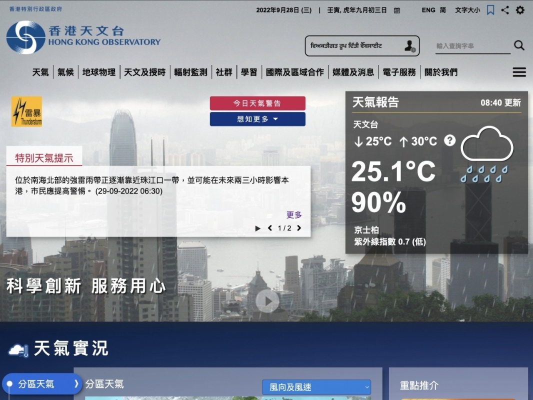 今日(29日)上午8時,香港天文台錄得氣溫28度,相對濕度82%。香港地區今日天氣預測大致多雲,有驟雨及幾陣狂風雷暴,最高氣溫約30度,吹和緩至清勁偏東風,初時離岸間中吹強風。