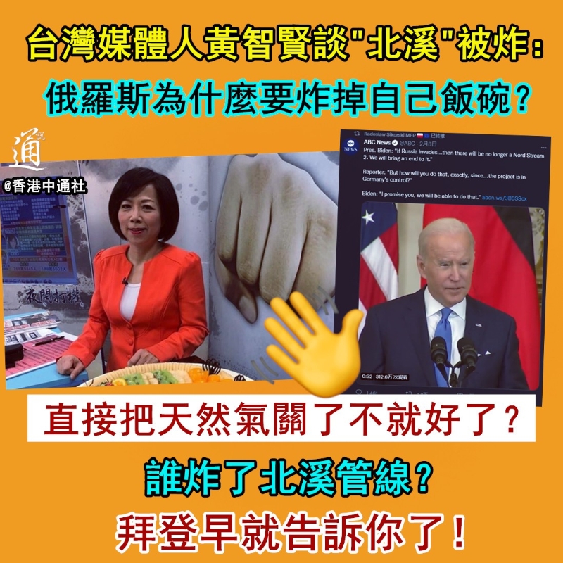 台媒體人黃智賢:誰炸了北溪管線?拜登早就告訴你了香港新聞網9月29日電 “北溪”被炸,對台灣島內的震動不小? 26日,“北溪1號和2號”天然氣管道遭到3處破壞,隨後洩漏區域發生水下爆炸,瑞典監測到有震感。次日,相關消息陸續傳出,引發歐洲各國恐慌。 德國、丹麥、瑞典已就事故原因立案調查。截至目前,各方均認為北溪管道洩漏“可能是蓄意破壞”。據瑞典媒體28日最新消息,瑞典海岸警衛隊在“北溪”天然氣管道發現了第4個洩漏點。 就可能的幕後黑手,目前各方眾說紛紜...... 28日,台媒體人黃智賢在社交媒體發文分析“北溪誰炸的”。她認為,事情發生得突然,卻在關鍵時刻——“歐洲開始天寒,能源不够又狂漲,人民水深火熱,撐不住了,到處都爆發游行抗議,要求各國當局不要抵制俄能源,德國人更進一步,要求打開北溪2號......” 黃智賢表示,種種舉動顯示歐洲人想要活下去,所以態度鬆動、不理解美國要打的俄烏戰爭,卻把歐洲人的生活賭上去。 偏偏在這個時間點,“北溪”爆炸。她分析稱,北溪管線是俄羅斯的生財工具,更是俄羅斯對歐洲博弈的杠桿,“北溪”爆炸是俄羅斯的損失,所以俄羅斯不可能幹。 “北溪”亦是歐洲生命線。黃智賢稱,“管線爆炸,唯一得利者是美國。” “如果用刑事偵查的邏輯來看,就是誰得利,事情就是誰幹的。”黃智賢指出,一艘液態天然氣船淨利1億美元。“美國在全球搞暗殺、爆炸、顛覆的事跡罄竹難書;背叛盟友這種事也常幹。”認為若幕後黑手是美國也不出奇。
