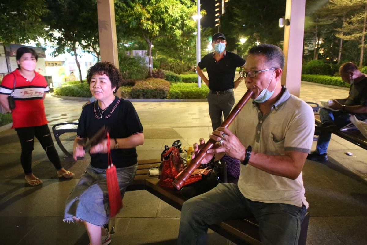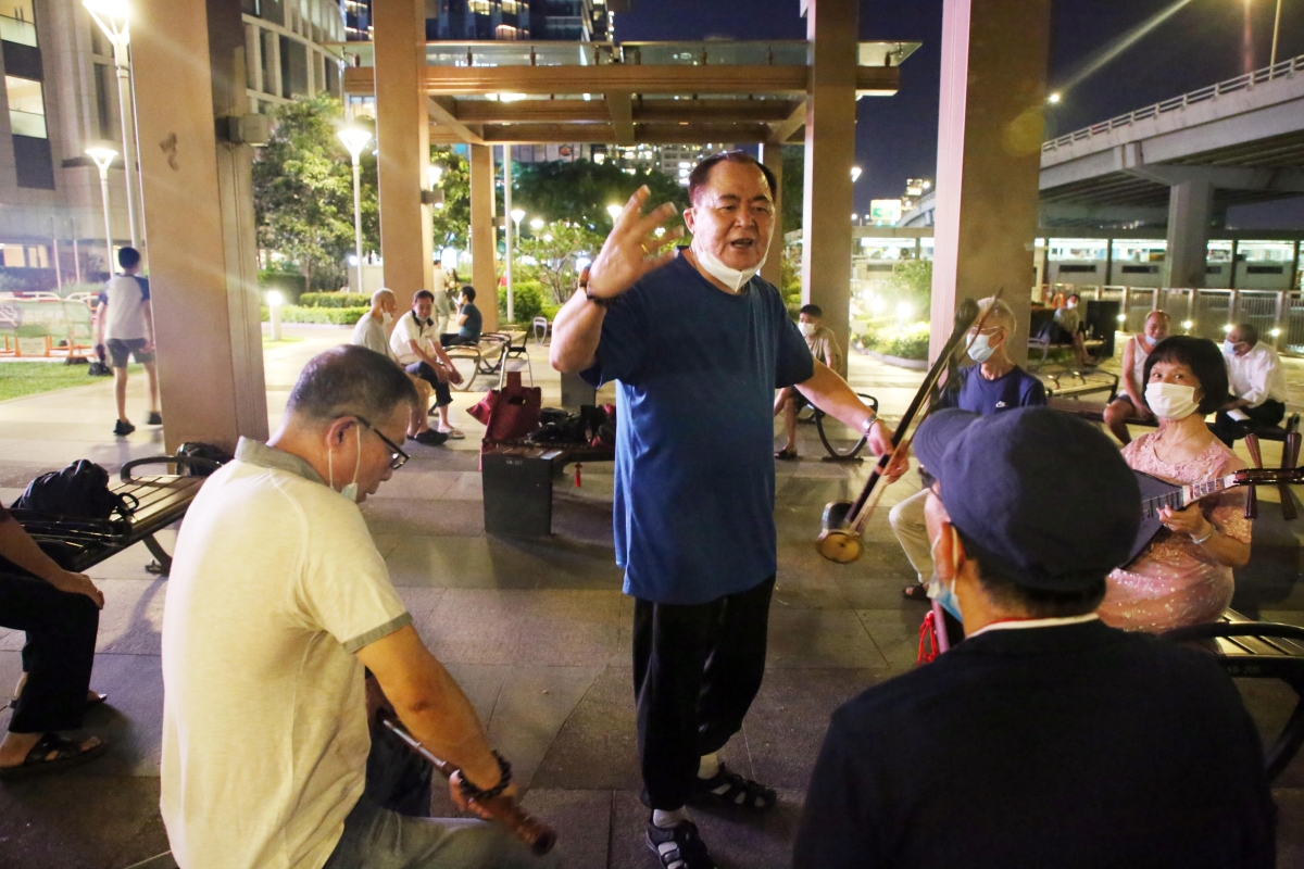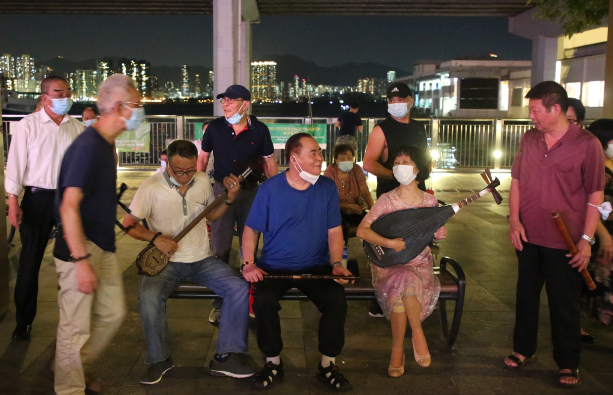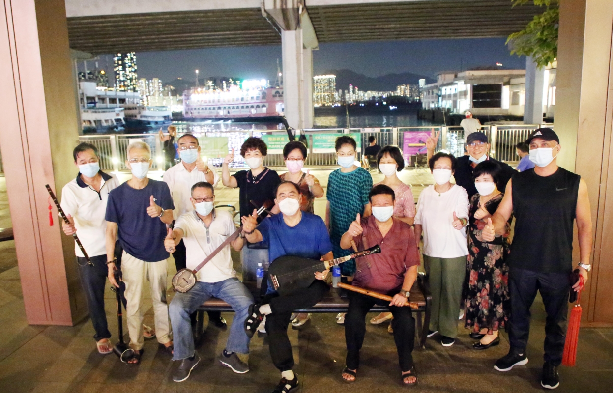 香港新聞網10月4日電 (記者洪少葵圖文)入夜,香港北角匯休憩处熱鬧騰騰,一陣陣古樂裊裊飄來,優雅“南音”音律吸引不少路人駐足欣賞。10月3日晚,南音彈唱召集人曾順昌先生向記者介紹,彈奏南音的樂手都是來自閩南一帶的居港老鄉,10幾年前就因為愛好南音聚集一起,常年在北角碼頭一帶彈彈唱唱,不亦樂乎。近年來,疫情肆虐期間,大家只能待在家裡自己練習。近日,香港疫情放緩,難得大家又可以聚在一起合奏練唱,拉近街坊鄰里關係,一解鄉愁,心情很是興奮。曾先生說,“在傳播中華傳統文化同時,很希望得到政府有關部門的關注,能提供場地和支持,令這項傳統音樂能够傳承下去”。南音是閩南人的生活中不可缺少的最愛之一,有“拳頭、燒酒、曲”之說,指練武、喝酒和聽南音。