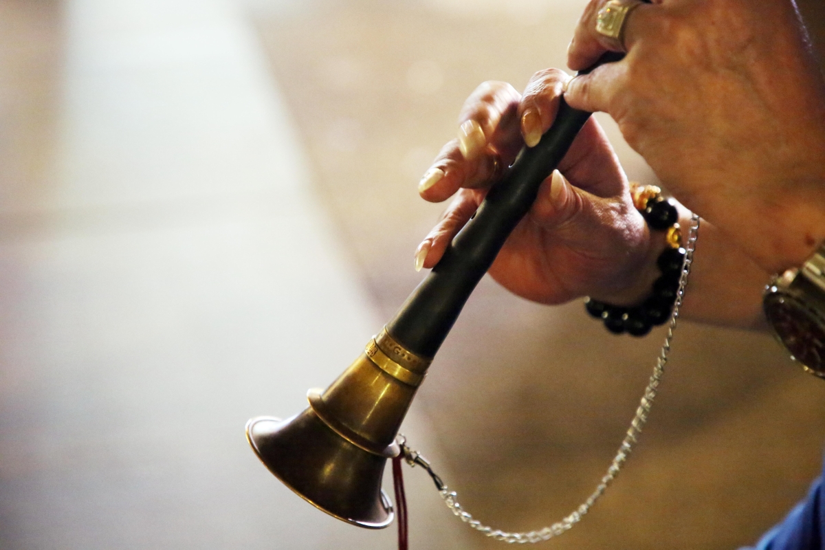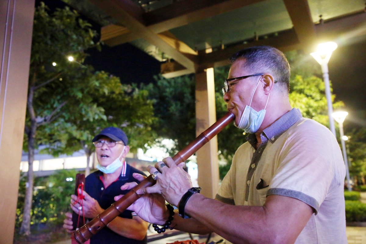 南音彈唱召集人曾順昌在吹奏洞簫。