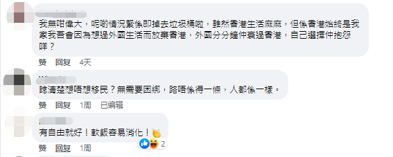 網友評論 至於帖主在英國生活稍有不順便想打退堂鼓一事,有網友諷刺,去了英國就該“入鄉隨俗”,認為這些困難在外國稀鬆平常,“沒什麼大驚小怪的,(不要)一點小事就想著回香港。”