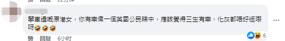 網友評論 還有網友諷刺崇洋媚外的移英港人,既然“有幸被一個英國公民看中,應該覺得三生有幸”,再也不要回到香港了。