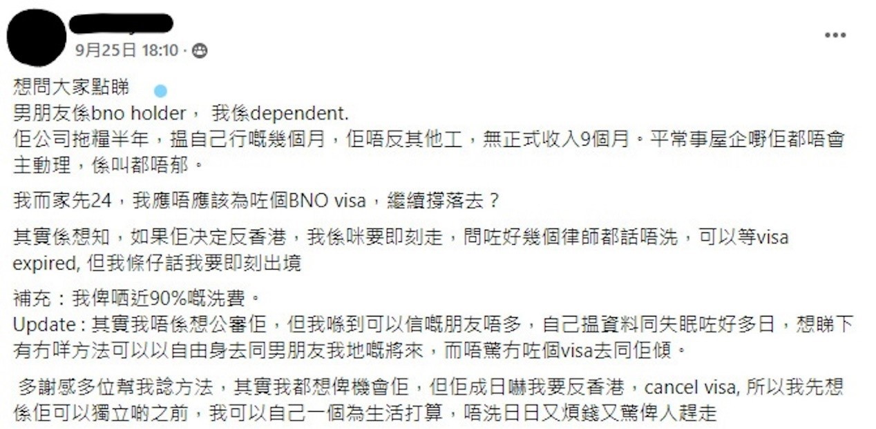 香港新聞網10月6日電 在英國遭遇不順後,一些移英港人反悔了,想回港。奈何卻被BNO簽證困住了…… 近日,一名移英港女在臉書專頁“英國香港人生化交流區”發文表示,自己今年24歲,於半年前跟隨擁有BNO簽證的男友移居英國生活,誰料男友到了英國被之前工作的公司拖欠工資半年,後來亦只肯找和從前行業相關的工作。“固執又懶惰”的男友已經連續9個月沒有任何正式收入。