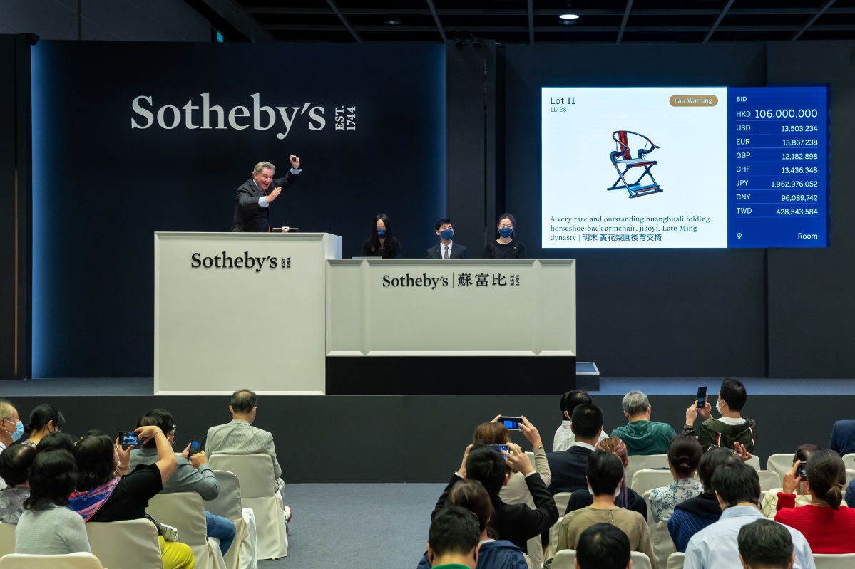 10月8日舉行的何鴻卿爵士私人珍藏夜拍,明代黃花梨圓後背交椅,經過歷時15分鐘的踴躍競投、超過60口出價,最終以1.24億港元成交,刷新世界交椅拍賣紀錄。這場萬眾期待的晚拍成績亮麗,全場總成交額合共4.69億港元,成交率高達93%。