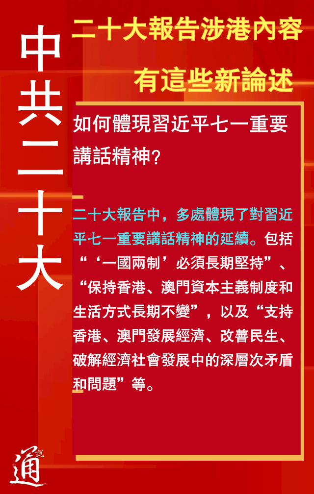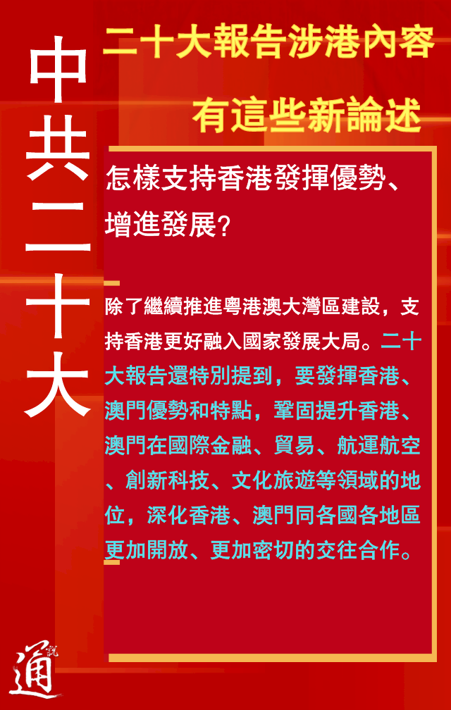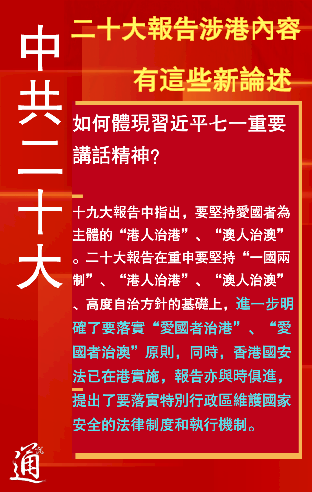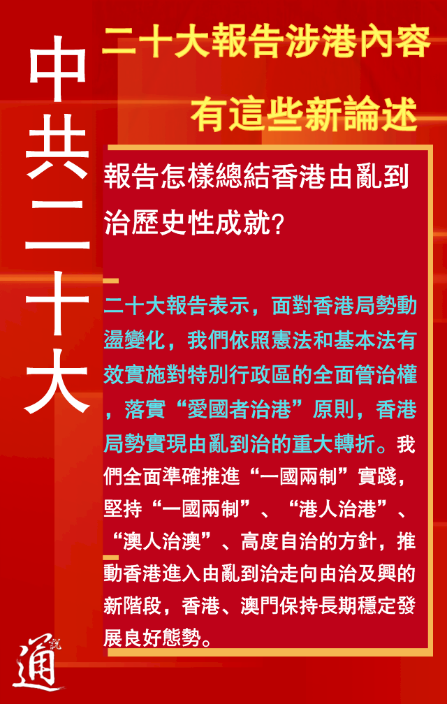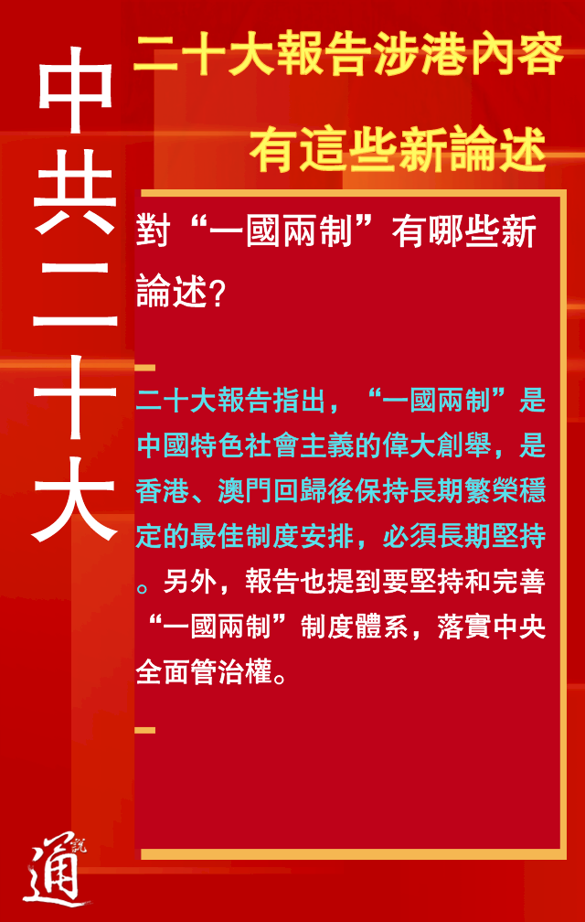 香港新聞網10月17日電 中國共產黨第二十次全國代表大會昨日(16日)上午在人民大會堂開幕,習近平代表第十九屆中央委員會向大會作報告。對比五年前的十九大報告,今次的涉港論述有了哪些新發展?