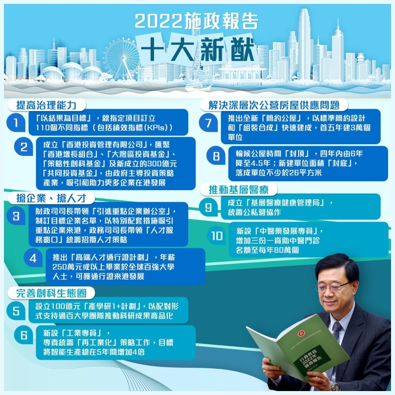 施政報告十大新猷 圖源:香港特區政府 推進《基本法》23條立法準備工作 由政務司司長領導的“基本法推廣督導委員會”將改名為“憲法和基本法推廣督導委員會”。政府將於本立法年度提交《區旗及區徽條例》的修訂草案,與《國旗及國徽條例》和《國歌條例》適度地保持一致。 為準確落實《香港國安法》的立法原意,我們會進一步健全香港維護國家安全的法律制度和執行機制,包括推進《基本法》第二十三條立法準備工作、立法規管線上線下眾籌活動、立法提升關鍵基礎設施的網絡安全、完成處理虛假訊息的顧問研究作政策考慮等。 成立“香港投資管理有限公司” 進一步用好財政儲備以促進產業和經濟發展,把近年在“未來基金”下設立的“香港增長組合”、“大灣區投資基金”和“策略性創科基金”,以及下文提到的“共同投資基金”歸一收納,匯聚有關資源,由政府主導投資策略產業,吸引和助力更多企業在港發展。 成立“特首政策組” 今年內成立“特首政策組”,提升政府對長遠和策略性議題的研究和倡議能力。“特首政策組”要從大局觀和國際觀出發,掌握本地社情民情,更要深入研究和分析內地政策和發展及國際形勢,向我匯報,同時建立恆常內部研討機制,協助政府制訂前瞻的政策。 引進重點企業 於今年內成立的“引進重點企業辦公室”,將針對生命健康科技、人工智能與數據科學、金融科技、先進製造與新能源科技等策略產業,專責引進世界各地高潛力、具代表性的重點企業。 高端人才獲發兩年通行證 合資格人才包括過去一年年薪達港幣250萬元或以上的人士,以及畢業於全球百強大學並在過去五年內累積三年或以上工作經驗的人士。此兩類人士可獲發為期兩年的通行證來港發展,不設人數限額。 IANG逗留期限延至兩年 非本地畢業生留港╱回港就業安排將逗留期限由一年延長至兩年,方便他們留港╱來港工作。另以試行形式擴展該安排至本港大學大灣區校園的畢業生,為期兩年,並於推出一年後檢討。 退還置業額外印花稅 向合資格外來人才退還在港置業額外的印花稅。合資格外來人才註如在今天或以後在港置業,可於居港七年並成為香港永久性居民後,就其已購入並仍然持有的首個住宅物業申請退還已繳付的買家印花稅及新住宅印花稅,但他們仍須繳交按“第二標準稅率”計算的從價印花稅。這將使其印花稅負擔與首次置業的香港永久性居民看齊。 成立“融入國家發展大局督導組” 政府將成立“融入國家發展大局督導組”,由行政長官擔任組長,三位司長任副組長,從策略和宏觀角度推進及督導跨局工作,加強與內地機構溝通,並定期舉行國家政策解讀活動。督導組的工作有四大領域:就香港對接國家“十四五”規劃和大灣區建設制訂策略方案;制訂進一步打通大灣區人流、物流、資金流、信息流的工作計劃和優次;強化與內地省市的區域性合作機制;積極推展香港與“一帶一路”國家經貿、專業服務及人文合作的高質量發展。 強化最大離岸人民幣業務中心優勢 推動市場提供更多以人民幣計價投資工具,以及穩妥高效的匯兌、匯率風險和利率風險管理等財資服務,並優化市場基建。全速落實中國證券監督管理委員會早前宣布支持的一系列互聯互通安排,包括今年內提交條例草案,寬免雙幣股票市場莊家交易的股票買賣印花稅以優化人民幣股票交易機制,並盡快完成兩地利率互換市場互聯互通“北向通”的準備工作。 設立100億元“產學研1+計劃” 由明年開始以配對形式資助不少於100支有潛質成為初創企業的大學研發團隊分兩期完成其項目:第一期是三年內成功把科研成果轉化落地,第二期是隨後兩年內把科研成果商品化。目標是激勵產學研協作,進一步推動“從一到 N”的科研成果轉化和產業發展。