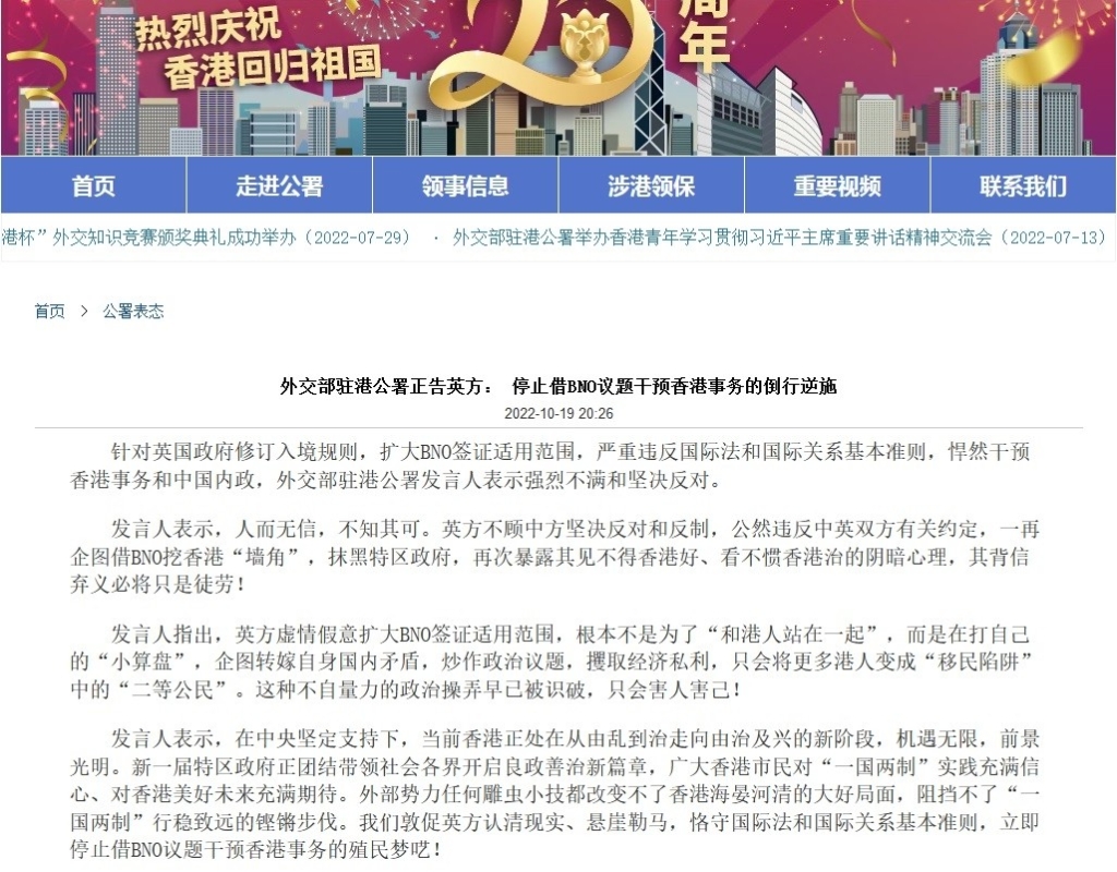 香港新聞網10月21日電 針對英國政府修訂入境規則,擴大BNO簽證適用範圍,嚴重違反國際法和國際關係基本準則,悍然干預香港事務和中國內政,外交部駐港公署發言人表示強烈不滿和堅決反對。