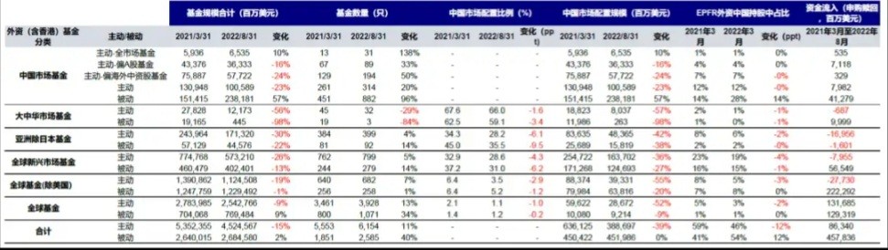 圖表:EFPR數據顯示,機構持續降低中國配置,主動型基金淨贖回是資金流出中國的主要原因