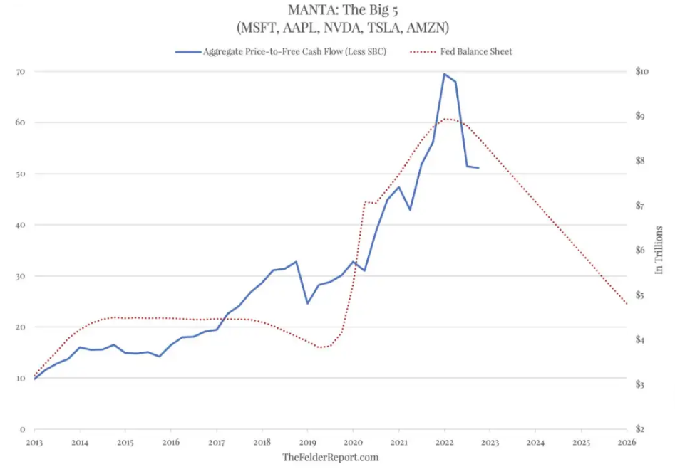 殘酷的去泡沫化 美國科技股的高估值和美聯儲上一輪的寬鬆政策有很大關係。 費爾德投資研究(Felder Investment Research)創始人Jesse Felder指出,如果把微軟、蘋果、英偉達、特斯拉和亞馬遜(MANTA))的市值與它們的總自由現金流進行比較,你會發現它們的預期市盈率是50倍。 這比2022年初的70倍有所下降,但依然非常高。 Felder表示,只有美聯儲大量印鈔支持現金流和貨幣乘數,才有可能出現這種歷史性的高估水平。然而,現在通貨膨脹肆虐,“印錢的機器開始倒轉,這已經產生了明顯的影響”。 下圖可以非常直觀地看出,科技股的估值和美聯儲資產負債表規模之間顯著的正相關關係。如果美聯儲兌現其在未來幾年實現資產負債表正常化的承諾,那麼這種估值的回歸才剛剛開始。