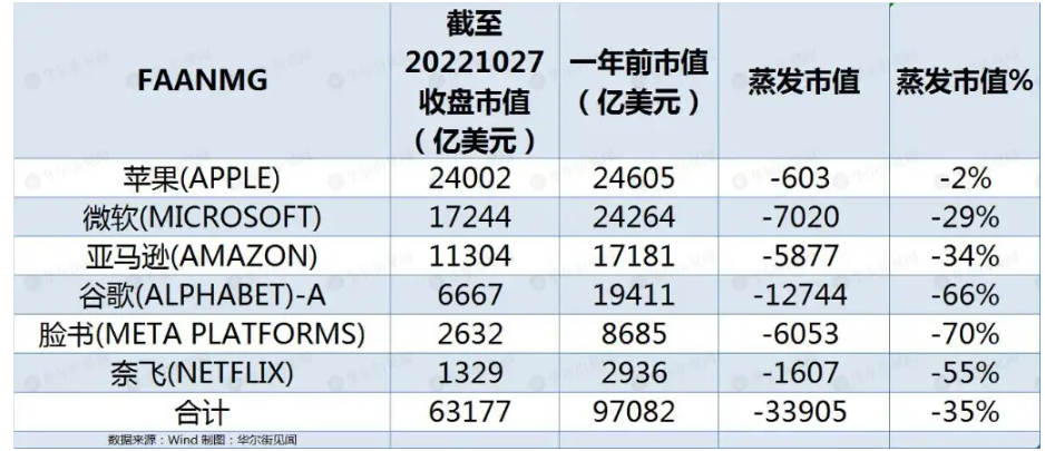 美股凶險!科技股大潰敗下還有雪崩?香港新聞網10月28日電 空氣中彌漫著肅殺的情緒。一年裡,超三萬億美元“灰飛煙滅”,但美國科技股的大潰敗可能才剛剛開始。 股市惡夢剛開始 就業績表現來看,“稱霸”美股多年的FAANMG紛紛折戟,除奈飛“一枝獨秀外”,Meta淨利潤同比暴降52%,微軟營收增速降至5年最低,谷歌增速跌回2013年最低水平,蘋果痛失兩位數增長,亞馬遜業績全面遜於預期…… 美國科技股三季報慘烈無比,帶崩全球股價,重挫市場信心,但這可能只是個開始。受益於全球貨幣寬鬆和科技進步,美股在過去十年間經歷了超長牛市。其中,以FAANMG為代表的科技類公司表現尤為亮眼,成為了推動納指乃至整個美股不斷走高的“發動機”。 但美聯儲激進加息正在扭轉潮水的方向,曾經風光無限的科技股無論是業績還是股價,都在經濟衰退陰雲和不斷飈高的利率下首當其衝。 加上疫情紅利退去、消費者支出放緩、美元走強、通脹上昇,曾經意氣風發的科技股也頓時籠罩在愁雲慘淡之中,頻頻因削減開支、凍結招聘、裁員而登上媒體頭條。 美國科技股最好的時代結束了。在這一年裡,有超三萬億美元的科技股市值“灰飛煙滅”。在截至10月27日的一年裡,FAANMG的市值合計減少了3.39萬億美元,同比下滑35%。一心All in元宇宙的Meta最為慘烈,一年時間裡市值打了三折(-70%);谷歌緊隨其後,市值蒸發66%,因經濟放緩重創了廣告需求。奈飛儘管三季度業績亮眼,用戶增長勢頭迅猛,關鍵指標全面碾壓預期,但過去一年市值依然遭到了腰斬(-55%);亞馬遜、微軟市值分別下滑34%和29%。 在這輪科技股史無前例的大規模拋售中,蘋果算是站穩了腳跟,市值微跌2%。