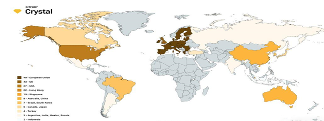 資料來源:coinmarketcap.com Crystal區塊鏈分析平台曾於2018年製作了一份報告,該報告共調查了63個國家和地區的300家交易所,其中,英國以43家交易所高居榜首,接下來分別是美國、香港和新加坡。其中,歐盟地區、美國、澳大利亞、新加坡和中國香港地區的比特幣轉帳額突出;2016年—2018年,連續三年,比特幣發送量最大的國家/地區依次均是美國、英國和香港。 在全球虛擬資產前進的道路上,香港從未缺席,這些數據說明了一切。 風險監管,香港適時出場 資本市場從來都是風險與機會並存。虛擬貨幣誕生的初心就是想避開法定貨幣的風險。 從2008年到2022年,距離全球金融危機已經過去整整十多年。在2008年金融危機之後,懷著改變金融格局、規避金融風險美好願景而誕生的第一種虛擬貨幣——比特幣,標誌著法定貨幣向虛擬時代發展,同時也開創了區塊鏈時代的新紀元。 比特幣總量恒定為2100萬枚,因其去中心化、安全不可逆、零信任、無限制等特點,因此被廣泛應用於貿易、支付和匯款等領域。現在所能找到的最早有記錄的比特幣價格的時間,是2009年10月5日,一個叫“新自由標準”的用戶,給版主線上支付了5.02美元,獲得了5050個比特幣。2013年,美國政府承認了比特幣的合法地位,使得比特幣價格暴漲。2021年巔峰時期,比特幣的價格達到了7萬美元/枚驚人的價格。對應比特幣的熱炒,各種虛擬貨幣、加密貨幣、專案代幣等產品層出不窮,駭客攻擊、交易平台投機詐騙也頻繁出現。 各國交易所之間的比特幣轉帳額分布圖,顔色越深,轉帳數額越大。