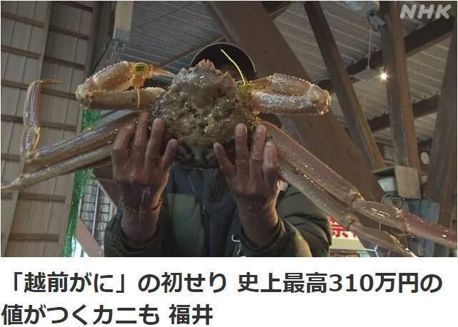 香港新聞網11月8日電 據日本放送協會(NHK)8日報道,近日,日本開放了對作為冬季日本海應季食品的雪蟹的捕撈。在福井縣越前町“越前蟹”的首次競拍中,一隻螃蟹以310萬日元(約16.6萬港幣)的高價成交,這也打破了越前漁港的拍賣紀錄。