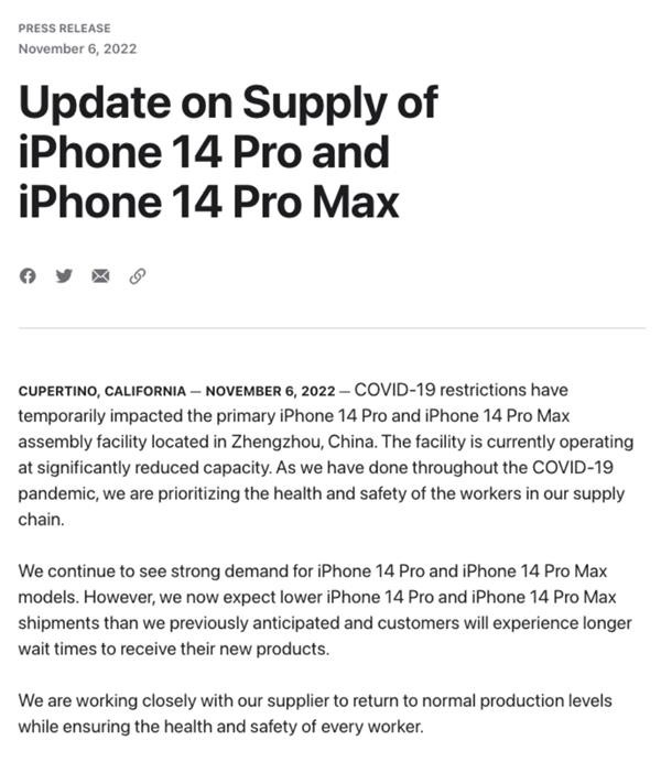 蘋果公司官網聲明 蘋果公司還表示,目前正與供應商密切合作,在確保每一位工人健康和安全的同時,恢復正常的生產水平。 就在蘋果官方發佈公告同日,鄭州富士康連夜啟動招聘。 富士康招募公眾號發文稱,“因公司業務需要,現計劃啟動預招工,以小時模式入職,時薪30元,工期至2023年2月15日,入職不滿7天離職者,按照同工同酬薪資發放。” 同時,對於10月10日-11月5日期間離職返鄉的老員工,富士康在其重新入職後將給予一次性關愛補貼500元,隨當月薪資發放。老員工報到時公司統一組織“點對點”閉環輸送。 河南各地人社部門以及勞務中介亦在積極幫助富士康招工。 據河南省開封市通許縣人社局向媒體介紹,縣人社局制定了協助富士康預用工保障工作方案,全力以赴滿足富士康用工需求,推動盡快復產達能。 據21世紀經濟報道,高級分析師吳怡雯稱:“估計富士康正在將訂單轉移到其他地區。富士康深圳園區目前正在為其iPhone產品線積極招聘員工。” (完) 【編輯:王軼南】