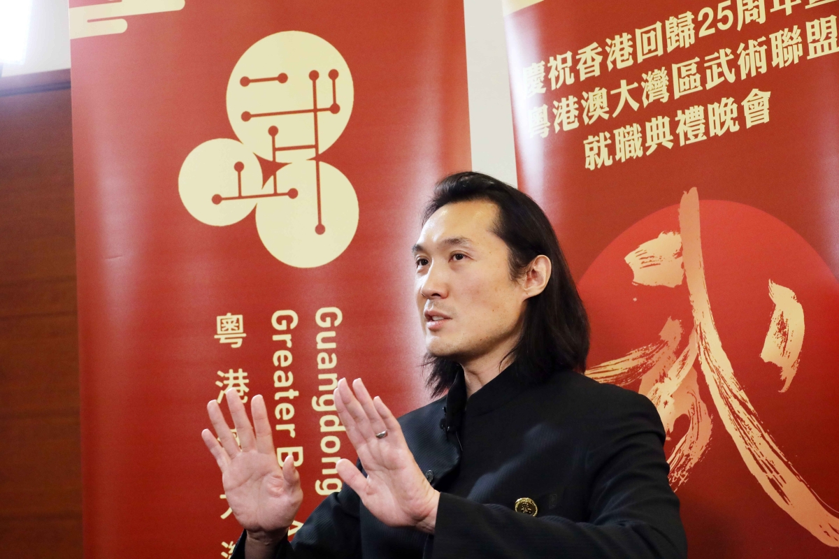 接受香港中通社專訪當天,趙式慶參與籌辦的粵港澳大灣區武術聯盟成立,他是召集人。身高八尺、不羈長髮,一身中山裝,一口流利普通話,在會場很難不被他吸引。