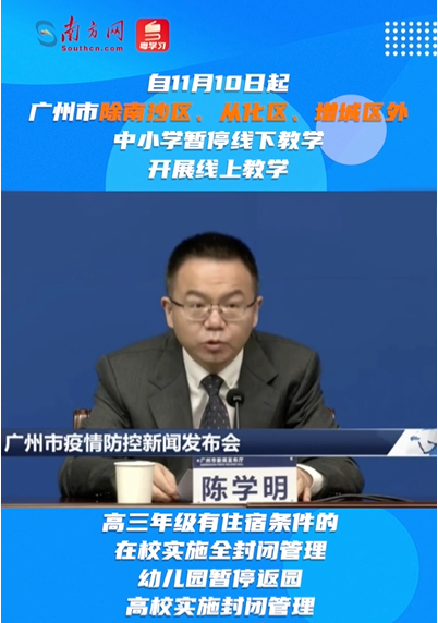廣州宣佈多區停課 圖源:南方網 廣州疫情最嚴重的海珠區,原定在7日24時結束的靜默管理措施已被延長至11日24時。荔灣區9日起至13日24時實行“強化社會面疫情防控措施”,嚴格控制人員流動。廣州市教育局則宣布,10日起除南沙區、從化區及增城區外,其餘8區的中小學及幼稚園暫停面授課堂。 近來單日感染病例仍保持兩位數增長的北京,9日首都機場宣佈取消75%的航班,共718架次。大興機場則宣佈取消86%的航班,共767架次。 同樣疫情出現上昇的重慶,當地江北機場9日宣佈取消航班713架次,占比72%。 (完) 【編輯:王軼南】