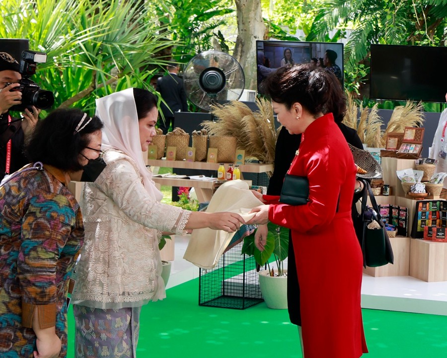 在伊莉亞娜陪同下,彭麗媛觀看當地樂器、服飾、藤編、刺綉和生態食品展覽,體驗棕櫚葉編織等印尼傳統手工藝品製作。