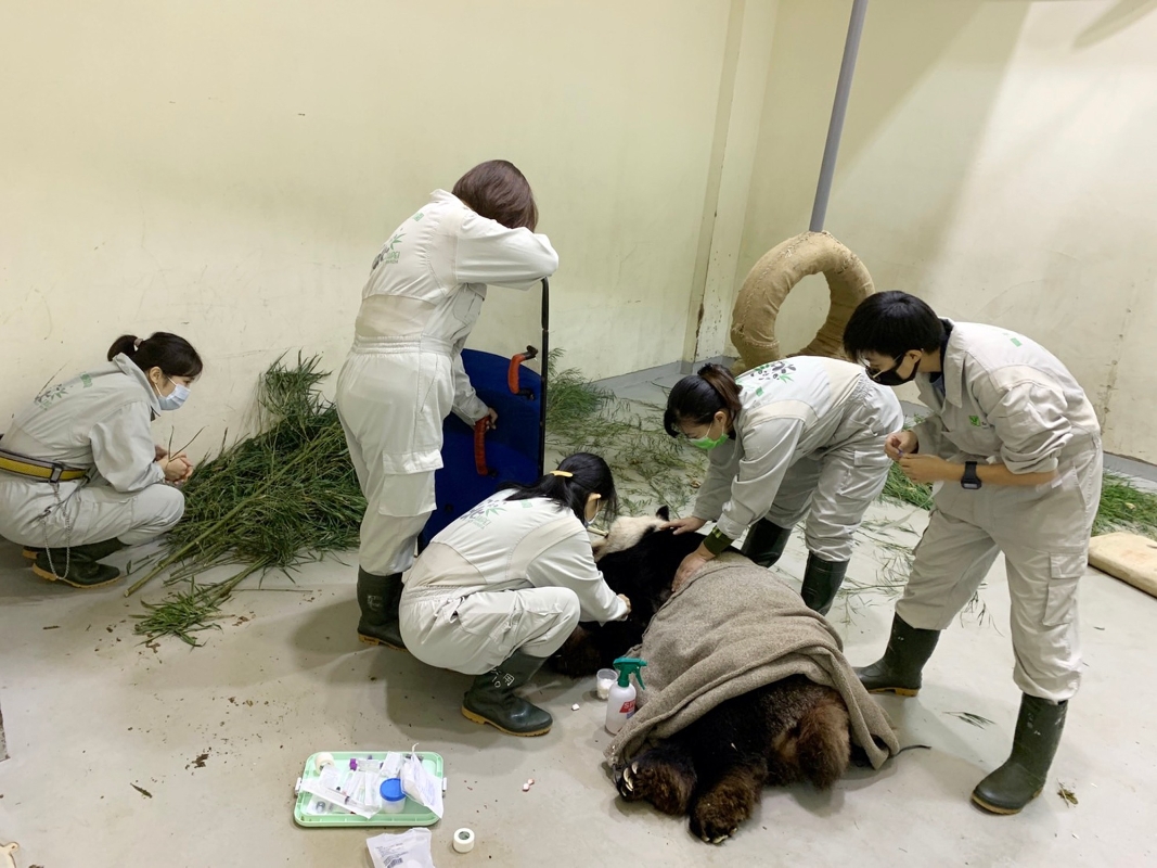 大熊貓“團團”11月17日突發四次癲癇,醫療照管團隊徹夜守護。 香港中通社圖片 台北動物園表示,保育員及獸醫師17日早上發現“團團”精神狀態不佳、食慾不振,連保育員呼喚也未有明顯反應,因此開始加強對“團團”的行為觀察。 【編輯:王軼南】