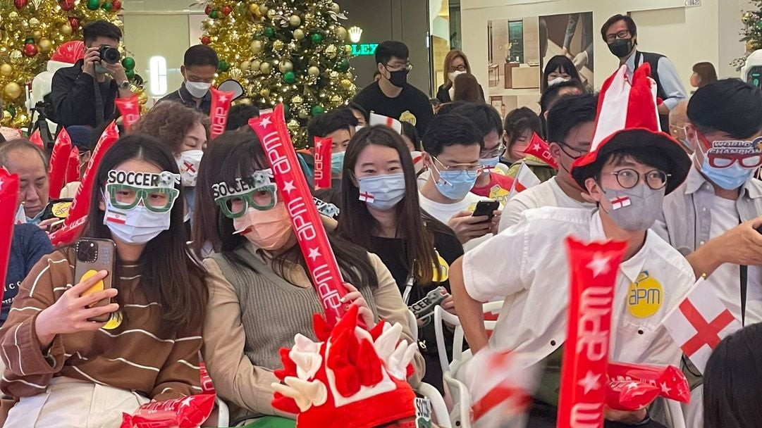 21日晚上,觀塘一間商場設大屏幕供球迷看球賽,開場前已有數十名球迷到場,不少人身穿球衣,舉起打氣棒、英格蘭及伊朗國旗,口罩亦貼上國旗貼紙,支持心儀的球隊。商場內多個樓層的圍欄,也聚集了不少市民觀看球賽,當英格蘭入球時,球迷紛紛拍手歡呼。有英格蘭支持者形容心情興奮,希望“入多幾球”。 有球迷表示,特區政府陸續放寬防疫措施,決定外出觀賽,雖然人流不及往年,但相信隨著賽事如火如荼進行,氣氛會熾熱起來。有球迷指,專程到商場觀賽支持伊朗,雖然工作日晚上觀賽的人不多,加上疫情影響,但氣氛已算不錯。 世界盃氣氛亦刺激消費。當天晚上,九龍城一間酒吧入座率約七成,幾乎都是球迷專誠相約出來一起看球賽。有球迷指,現在可以和其他朋友,認識不認識都可以一起看球賽,會每晚都來看。也有市民說,大夥一起看球賽會開心一些,每晚都會到酒吧消費約一千港元,認為物超所值。