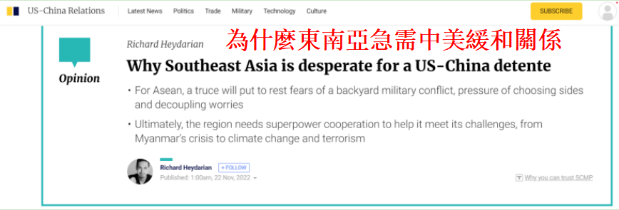 香港《南華早報》報道截圖 文章稱,中美兩國領導人在G20峰會期間舉行了會晤,并同意恢複廣泛的制度化雙邊對話。此次會晤是在美國眾議院議長佩洛西竄訪台灣,雙方持續了幾個月的緊張局勢之後召開的。 在本月舉辦了多場峰會的東南亞地區,中美關係的“緩和”讓人們鬆了一口氣。在激烈爭奪東南亞戰略主導地位的過程中,該地區一直對中美之間“不受約束的競爭”所帶來的經濟政治影響而深感憂慮。 文章認為,近年來,不斷惡化的中美關係在三個層面上向東南亞國家提出了“生存挑戰”。