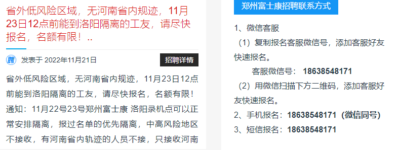 鄭州富士康招工信息 圖源:富士康招聘網 記者查詢富士康招聘網站看到,首頁第一條以醒目紅色字體發佈招工消息"省外低風險區域,無河南省內規跡,11月23日12點前能到洛陽隔離的工友,請盡快報名,名額有限!" 鄭州富士康招工通知明確寫明,“行程碼有河南省內軌跡的人員不接,只接收河南省外的低風險區域人員。” 通知還特別說明,在當地政府的部署與指導下,公司在防疫措施、住宿設施、環境消殺、員工關愛等方面完成了全方位的加強與改善。進入地市隔離點的員工,享有4天隔離生活補貼(含3天地市隔離和1天點對點輸送報到)。在職滿15天,補貼標準按照400元/天計算;在職不滿15天,補貼標準按照100元/天計算。在職滿30天額外享有3000元穩崗津貼,符合在職條件後,隨當月薪資發放。 鄭州富士康招聘人員宋麗指出,這次招聘是鄭州富士康近年來給時薪工的最好待遇。員工入職日開始按照30元/時計薪。入職未滿7天離職者,按照同工同酬薪資發放。時薪工基本工資加上約1000多元隔離補助和6000元的兩個月在崗津貼,平均月入過萬。 鄭州人社局工作人員也指出,和本地的薪資相比富士康此次招工的薪資具有很大優勢。鄭州本地平均月工資不到4000元,但在此時進富士康打工,“在富士康三個月能頂在本市幹一年,年底前能攢兩三萬回家過年。”(完) 【編輯:王軼南】