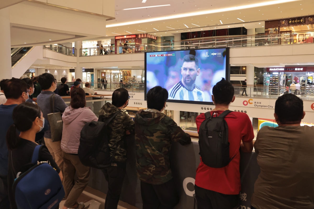 香港中通社圖片 在香港,球迷想觀看賽事需要向電視台付費,今年NowTV獲得這屆世界盃的香港地區獨家轉播權,其世界盃通行證售1080港元。因此,提供免費球賽直播的商場和酒吧餐廳成為香港一眾球迷“薅羊毛”的好去處。 今年有逾10家商場參與世界盃直播,設大屏幕供球迷免費觀賽。