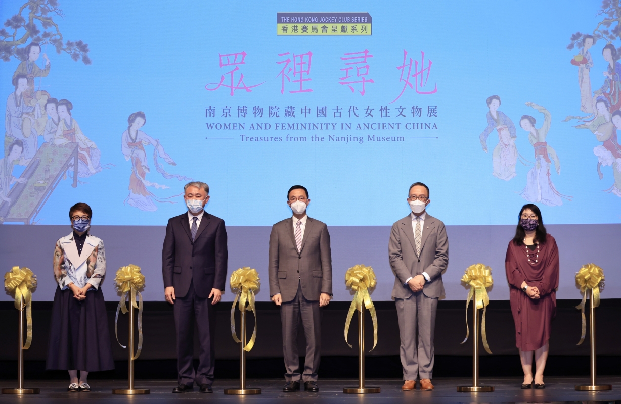 香港康樂及文化事務署副署長(文化)譚美兒(左起)、南京博物院副院長王奇志、香港文化體育及旅遊局局長楊潤雄、香港賽馬會慈善及社區事務執行總監梁卓偉、香港文化博物館總館長盧秀麗主禮展覽開幕儀式。 【編輯:曹文毓】