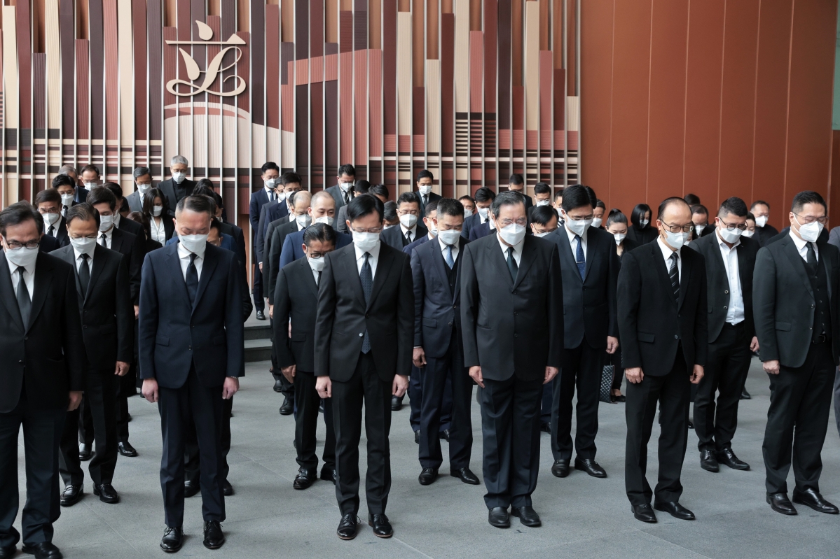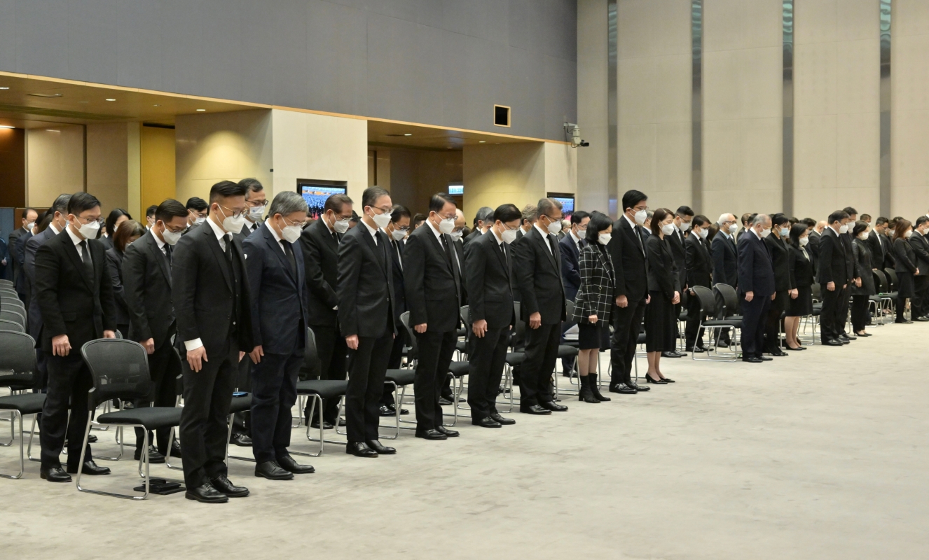 圖片來源:政府新聞處 行政長官李家超聯同各主要官員、行政會議成員、政策局及部門的首長級人員在政府總部收看追悼會直播,表達對江澤民的深切哀悼。